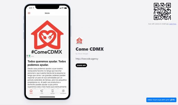 Para descargar esta app deberas ingresar al siguiente link https://comecdmx.glideapp.io/; en caso de que requieras registrar tu restaurante o negocio, es necesario llenar un formato, de este modo la base de datos de la aplicación lo incluirá de manera gratuita.