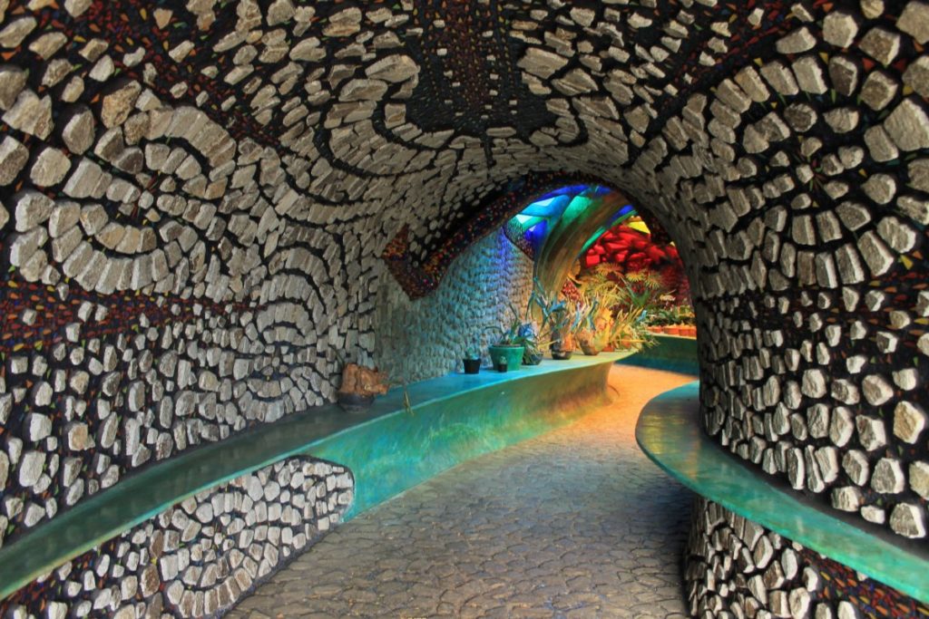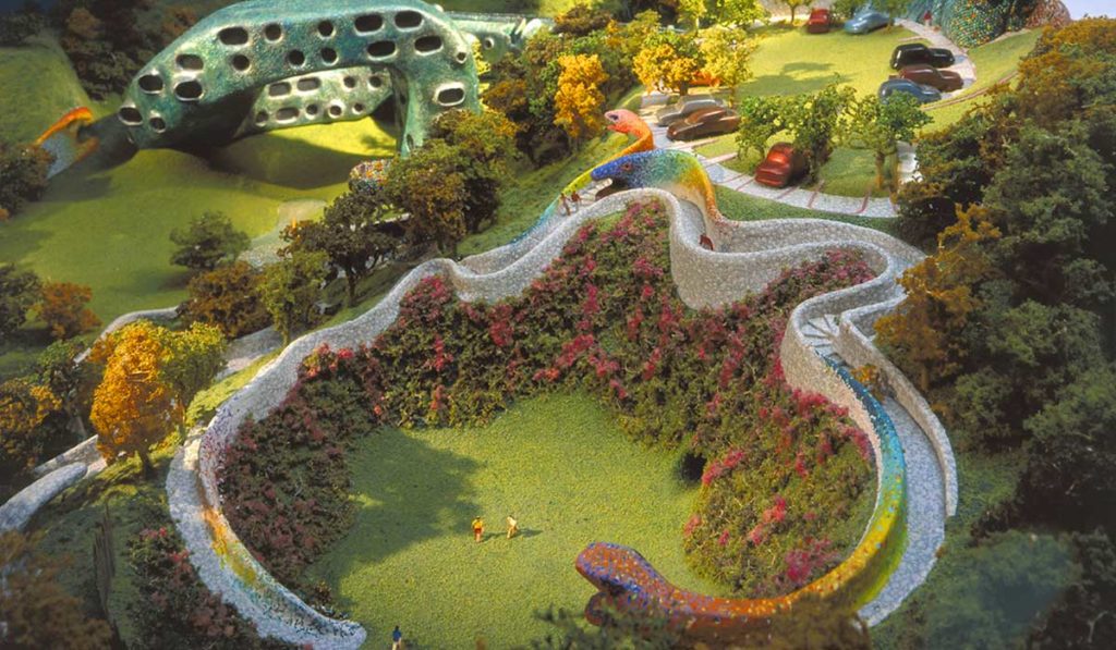 Además de las casas y la cueva, el lugar cuenta con jardines con figuras sinuosas, estanques y pequeñas cascadas que complementan el cuerpo ondulante de la serpiente.